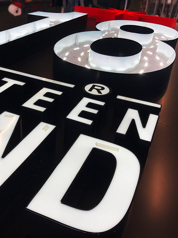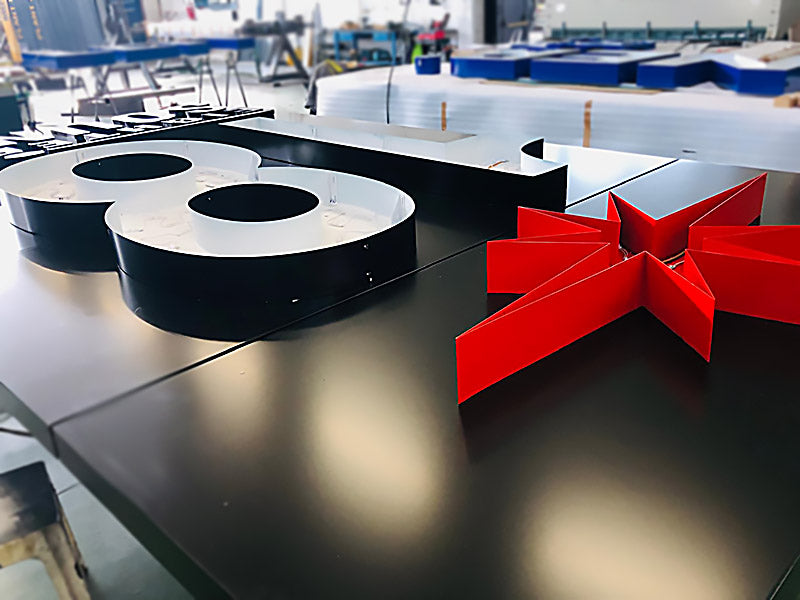 Per questo progetto abbiamo realizzato lettere scatolate in alluminio con illuminazione interna a led. Per un maggior contrasto cromatico e per un aspetto visivo più massiccio si è optato per la creazione di una pannellatura di fondo in alluminio nero.