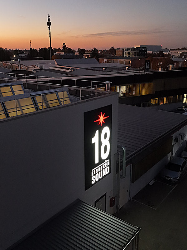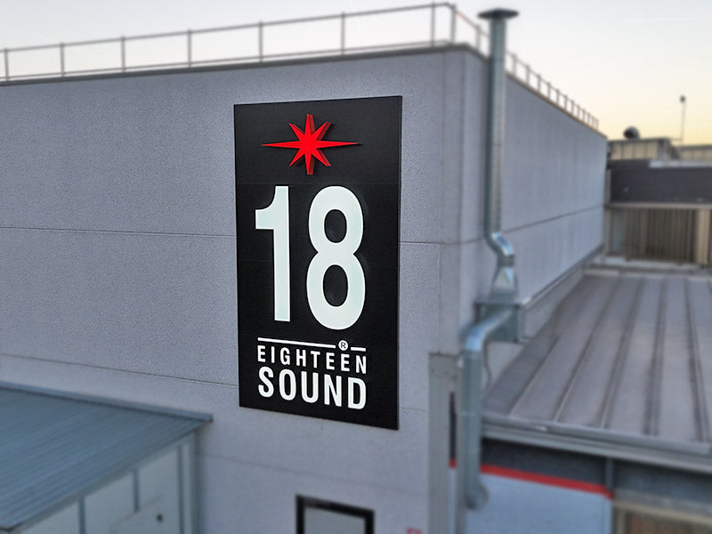 Eighteen Sound sceglie il nostro progetto di nuova insegna luminosa aziendale a lettere scatolari su pannellatura di fondo in alluminio.