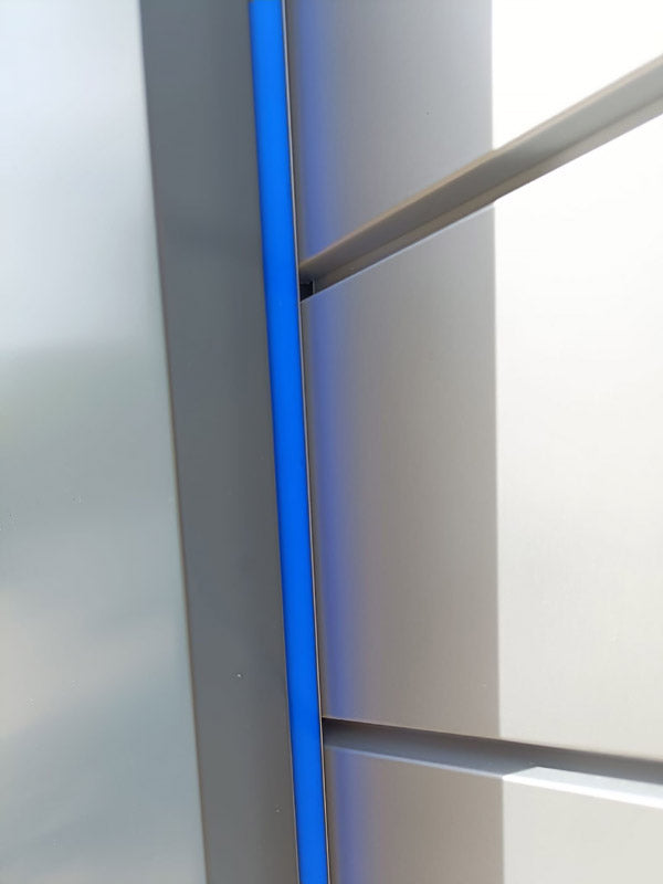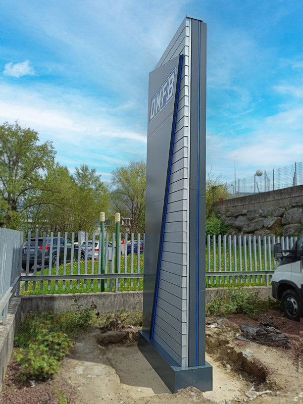 Totem molto impressivo ed elegante realizzato con un capitolato materiali di alto livello. Il totem è caratterizzato da un rivestimento piano di forma rettangolare composto da pannelli in alluminio composito fresato e scatolato. Frontalmente viene realizzata una ulteriore pannellatura di forma trapezoidale.