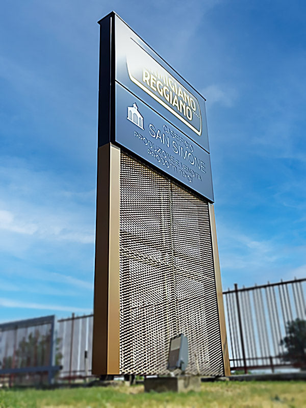 Caseificio San Simone - Totem aziendale luminoso design con rete stirata - Reggio Emilia