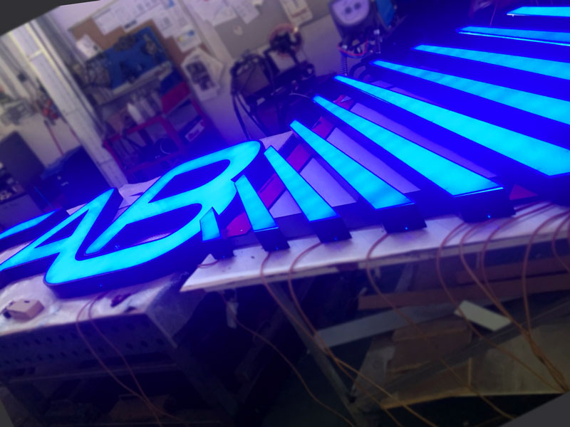 Pur avendo un logo complesso composto da molti elementi siamo riusciti a destrutturarlo realizzando ogni singolo componente con scatolari di alluminio saldato e verniciato. La retroilluminazione con led di colore blu e bianco in tinta con il frontale in plexi, ci ha consentito di ridurre lo spessore delle lettere realizzando così un'insegna aziendale dal design pulito e in grado di valorizzare il rivestimento della facciata.