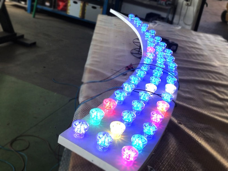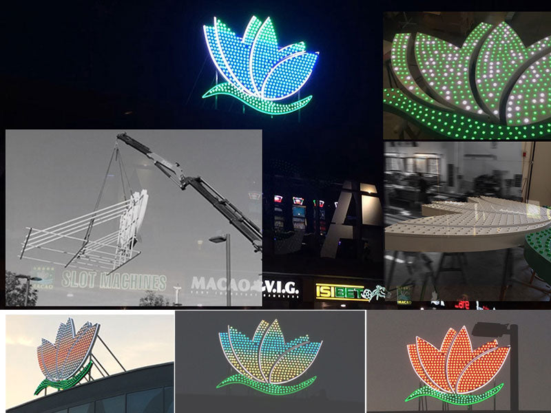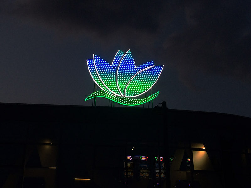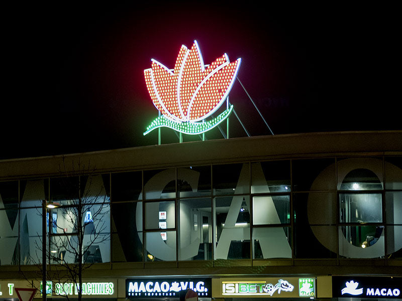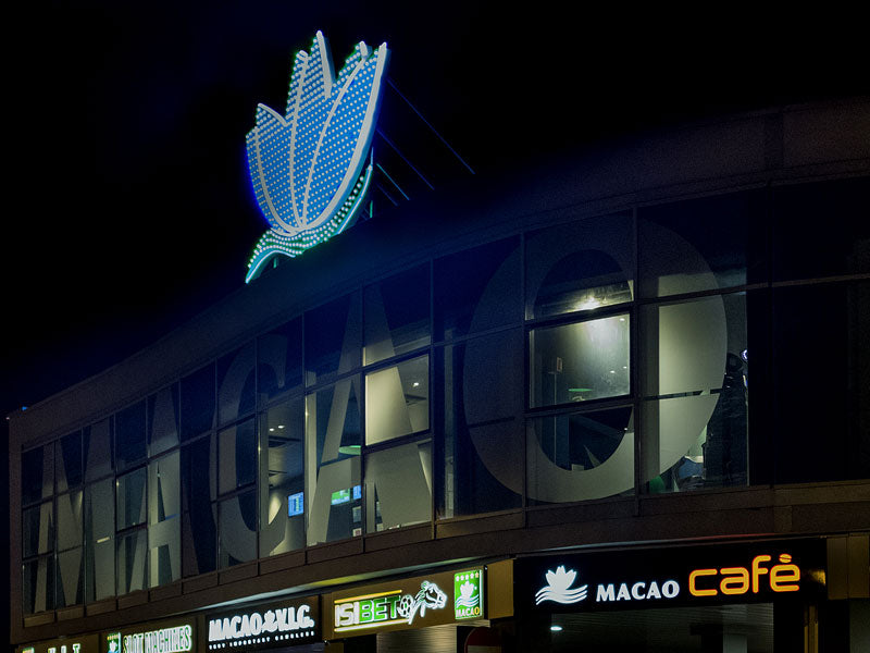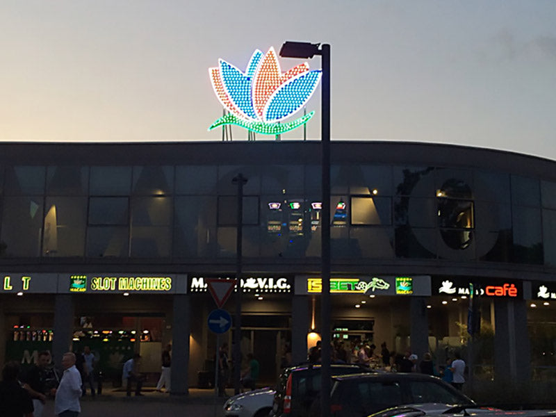 Macao, la catena Reggiana di sale Vlt potenzia il visual esterno della sala di Reggio Emilia optando per la nostra soluzione di insegna scatolare con inserimento di led rgb cabochon di altissima qualità. Un impatto notturno senza rivali con effetti luminosi programmati elettronicamente da remoto.