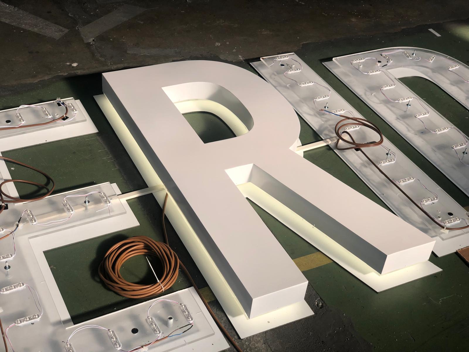 Per questo progetto abbiamo realizzato internamente nelle nostre officine l'intera produzione delle insegna partendo dal foglio di lamiera di alluminio grezza, fresata, saldata, molata e verniciata. Abbiamo inserito il fondello bianco sul retro per aumentare la riflessione luminosa e utilizzato led a luce neutra 4000 k° per un effetto più caldo ed avvolgente.