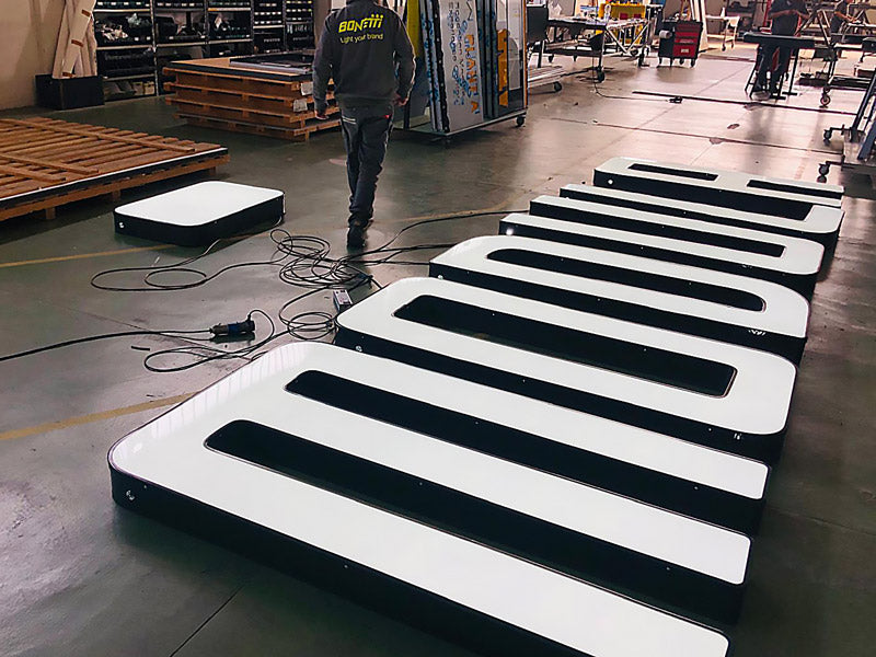 Per questo progetto abbiamo realizzato lettere scatolate a luce diretta in alluminio saldato e verniciato in tinta RAL nero con frontali in metacrilato colore bianco e giallo caldo. Il cablaggio luminoso è stato realizzato con led a luce bianca fredda 6500 K° marchiati GE di ultima generazione con ottica a 170° alta efficienza e basso consumo energetico.