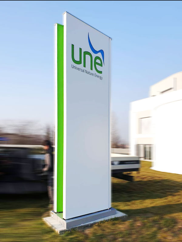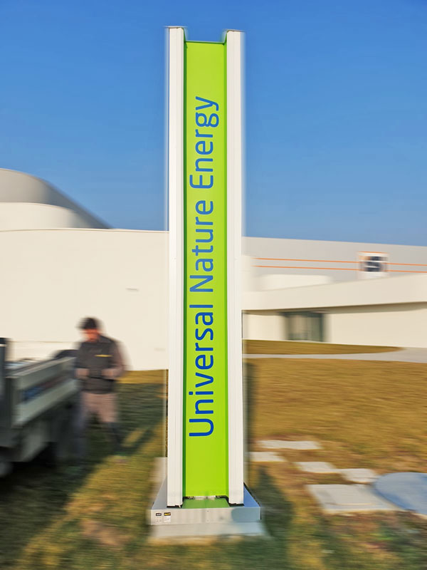 L'azienda Une Srl di Correggio rafforza il visual esterno della nuova sede con il nostro totem luminoso pubblicitario dal design nuovo ed attraente.