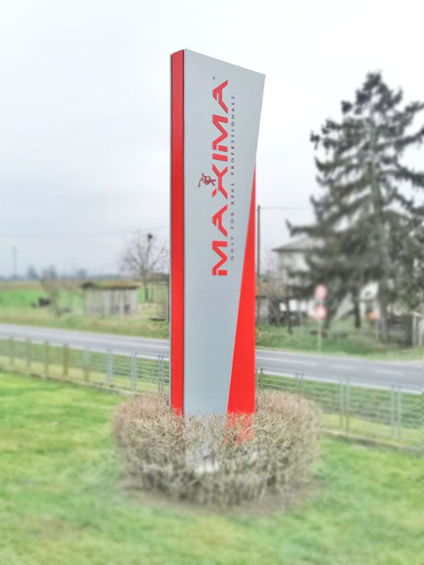 Un concentrato di design e tecnologia per valorizzare l'immagine aziendale. Il totem è caratterizzato da un rivestimento piano di forma rettangolare composto da pannelli in alluminio composito fresato e scatolato. Frontalmente viene realizzata una ulteriore pannellatura a forma trapezoidale.