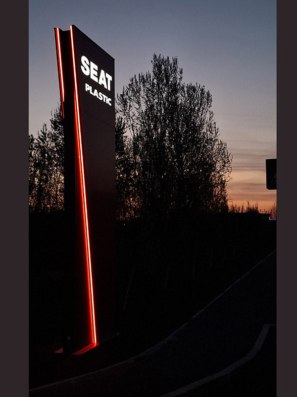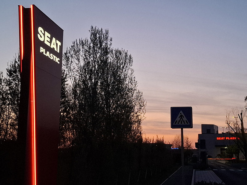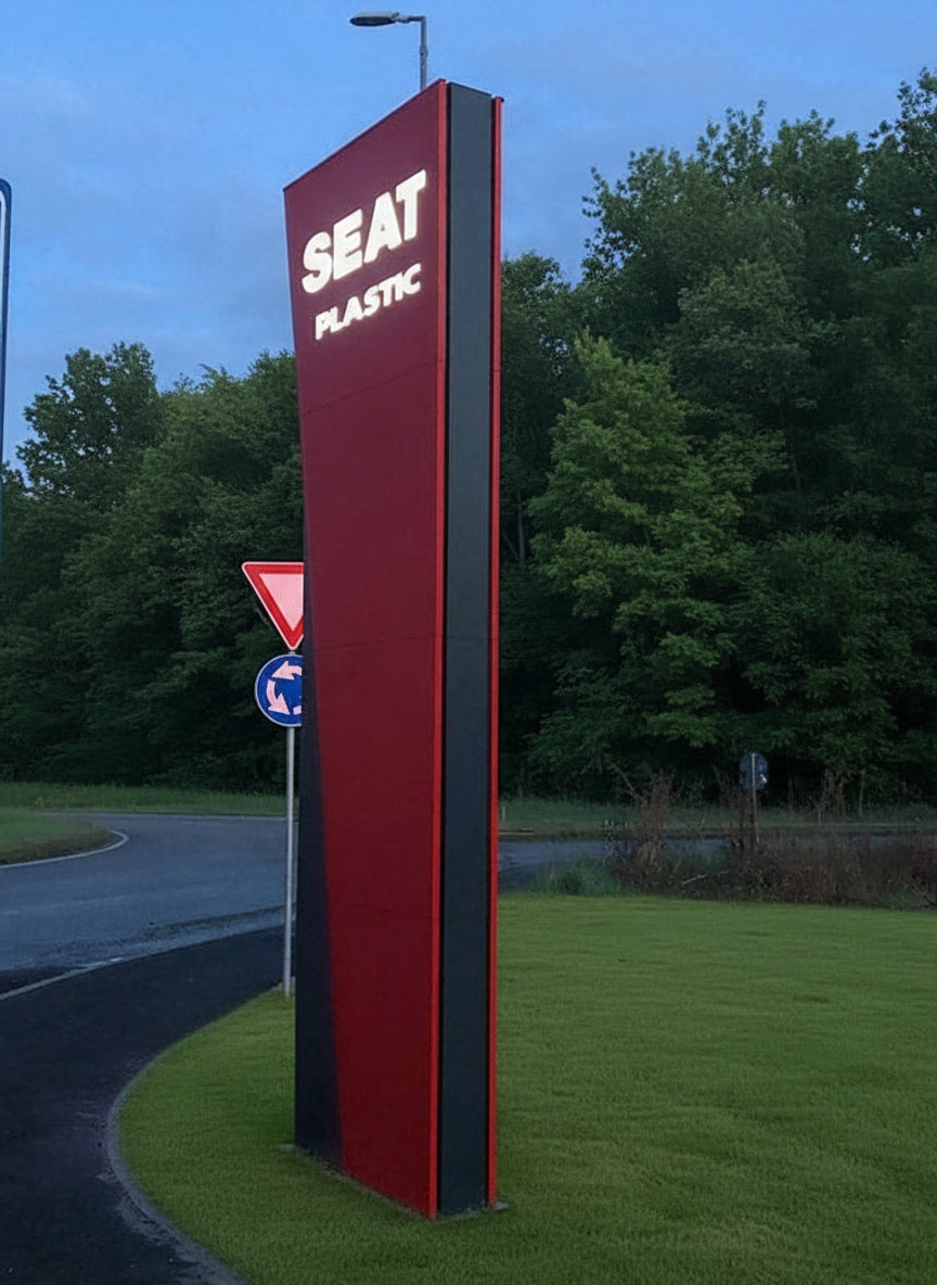 Un concentrato di design e tecnologia per valorizzare l'immagine aziendale. Il totem è caratterizzato da un rivestimento piano di forma rettangolare composto da pannelli in alluminio composito fresato e scatolato. Frontalmente viene realizzata una ulteriore pannellatura a forma trapezoidale.