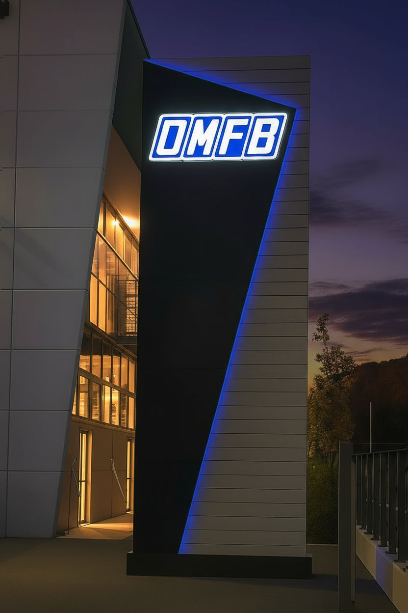 Totem molto impressivo ed elegante realizzato con un capitolato materiali di alto livello. Il totem è caratterizzato da un rivestimento piano di forma rettangolare composto da pannelli in alluminio composito fresato e scatolato. Frontalmente viene realizzata una ulteriore pannellatura di forma trapezoidale.